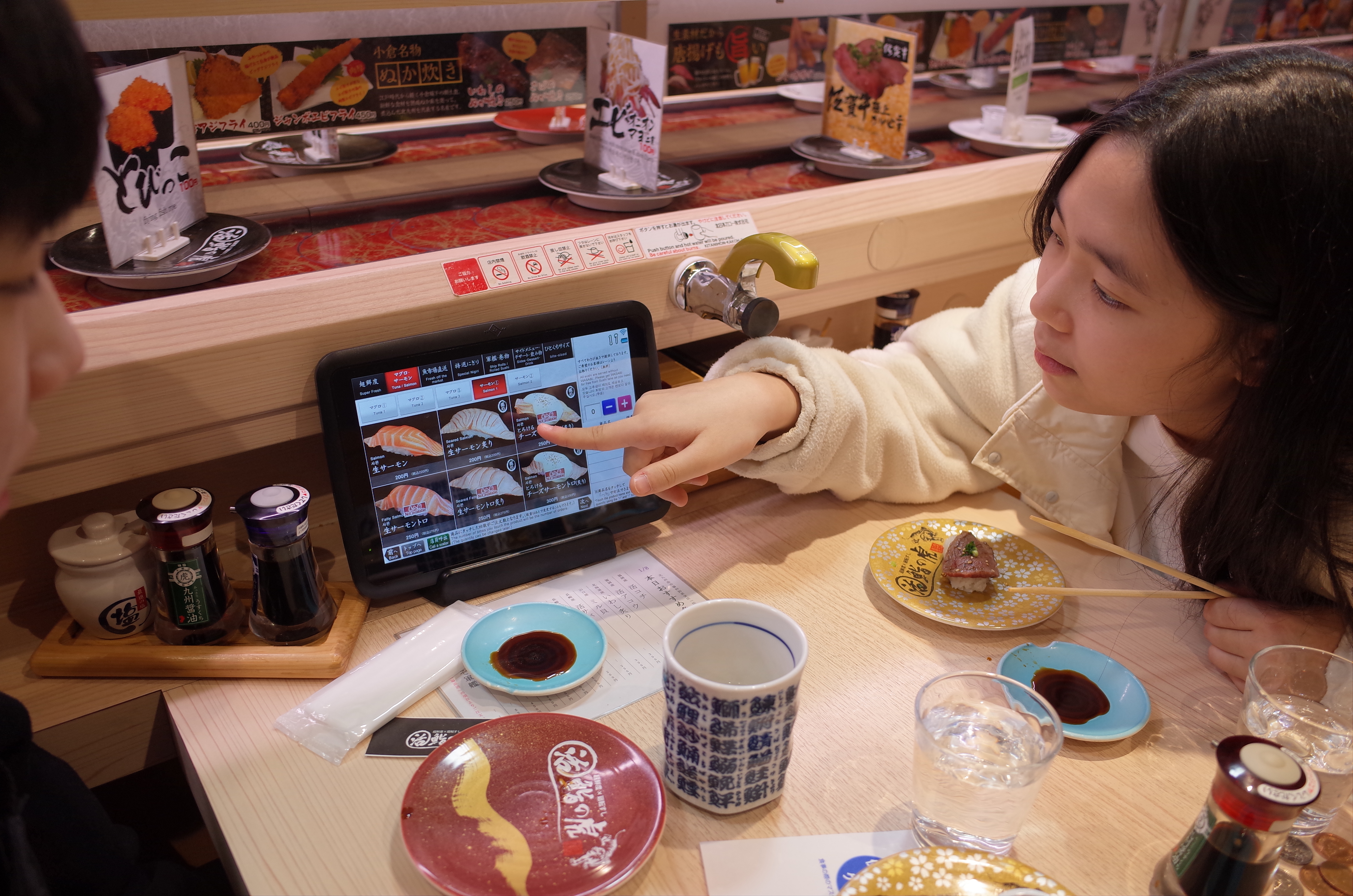 태블릿으로 주문하면 기차가 초밥을 가져다준다.