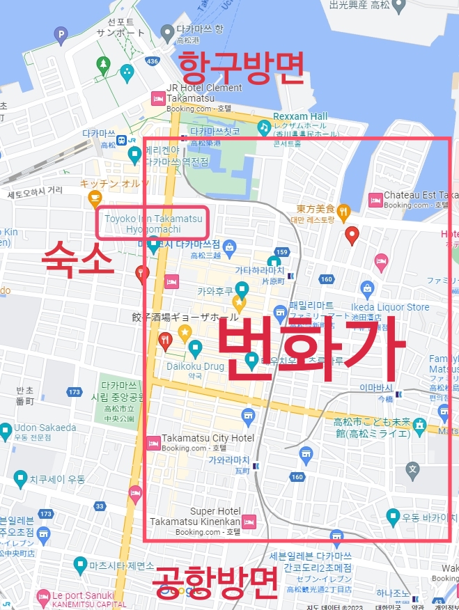 이런식으로 내가 묵었던 토요코인다카마쓰효고마치에서 길건너있는 저정도의 지역이